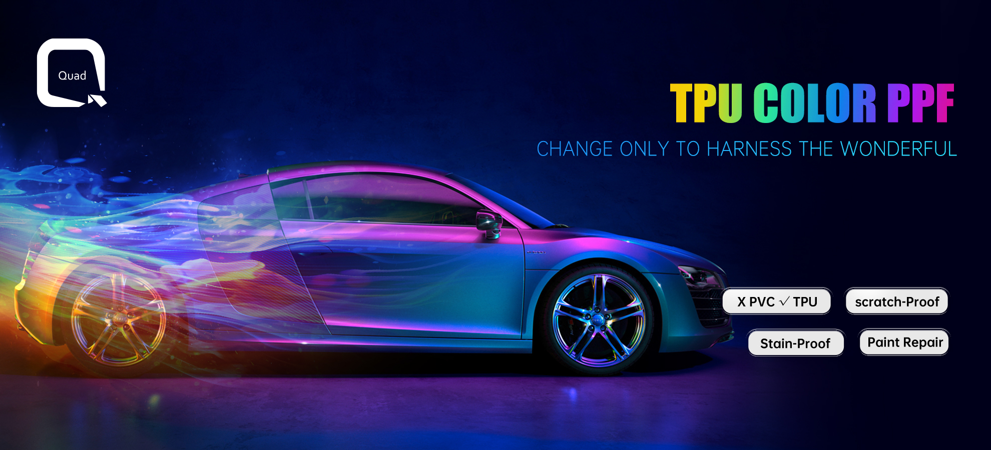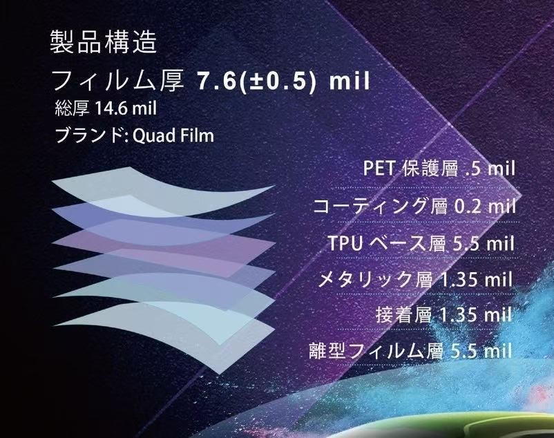 Quad TPUフィルムは革新的な”ドライ施工方式”を採用しており、簡単に施工でき、車体の色を自由に変更可能。貼り付け・剥がしも容易で、跡が残りません。汚れや傷を効果的に防ぎ、TPU素材特有の”熱による傷修復性能”を備えており、フィルムの寿命を大幅に向上させます。純正塗料の質感を深く再現し、”塗装のような仕上がり”を実現します。